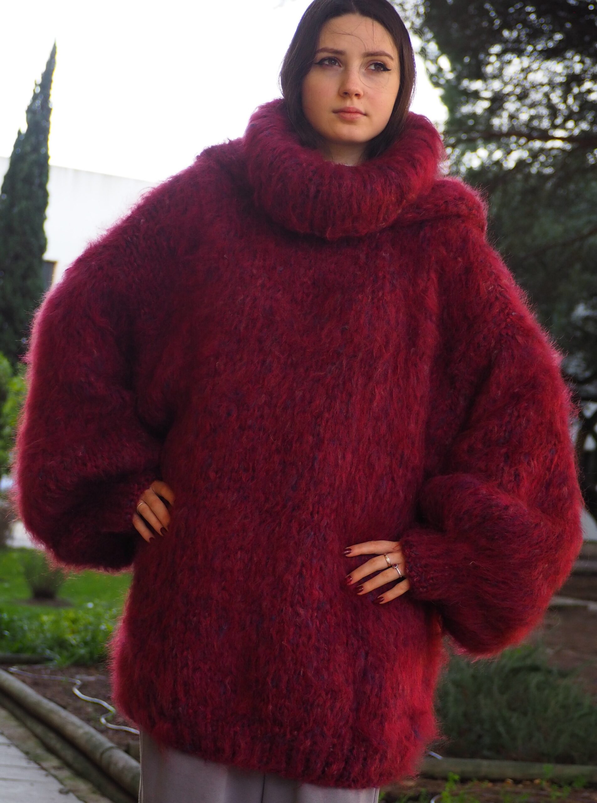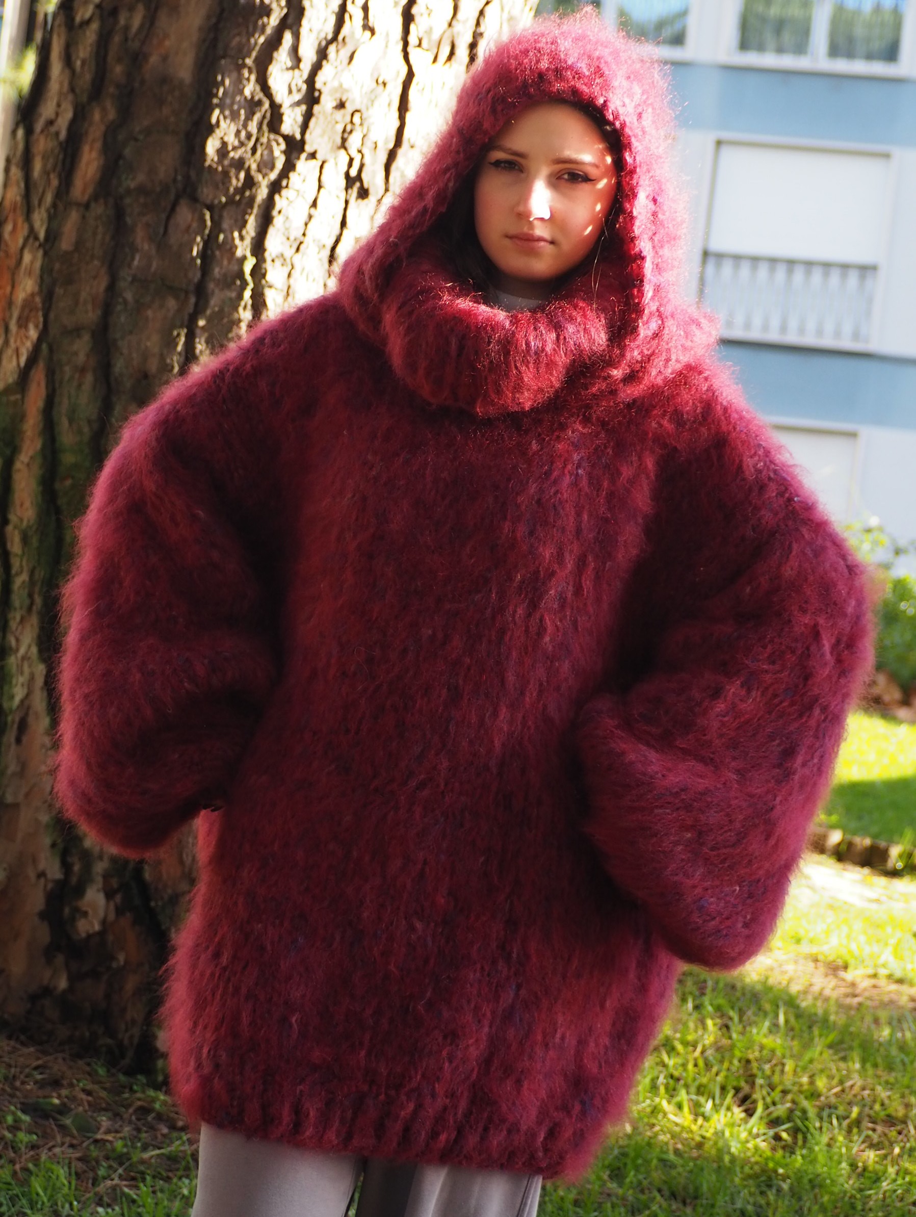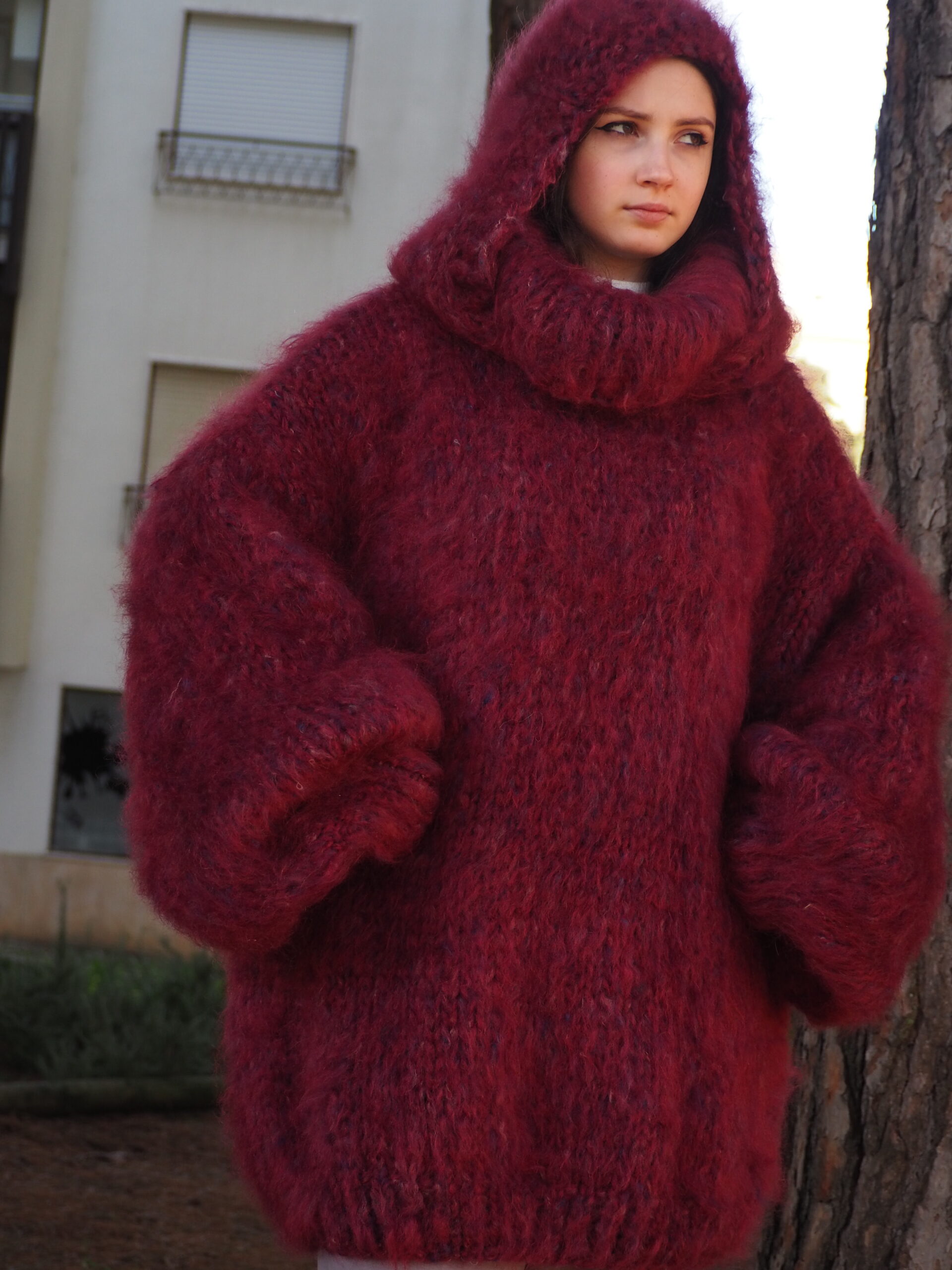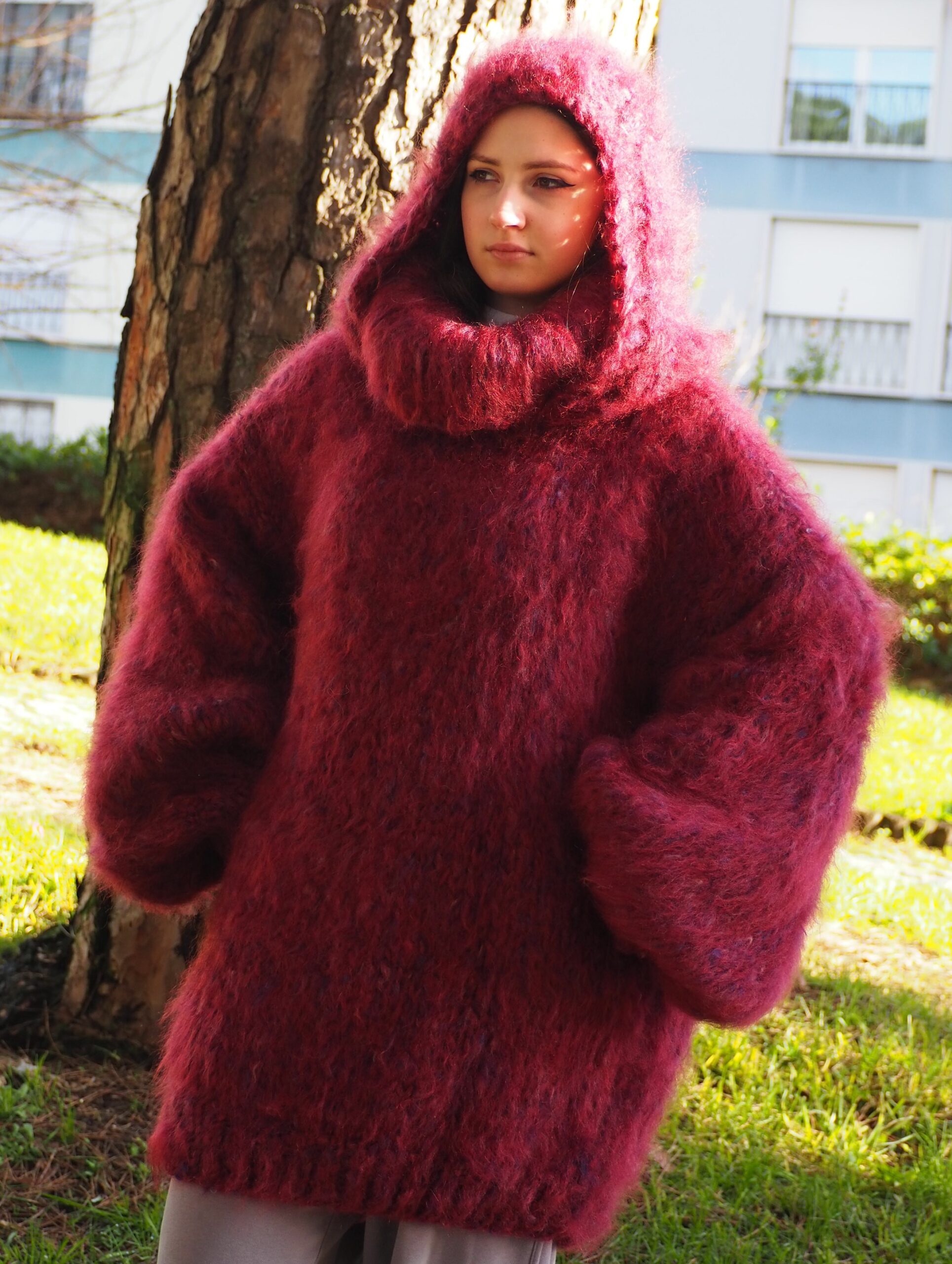 Mohair Sweater Extra Thick Oversize Burgundy T-neck and Hood Handknitted by Lanaknittings