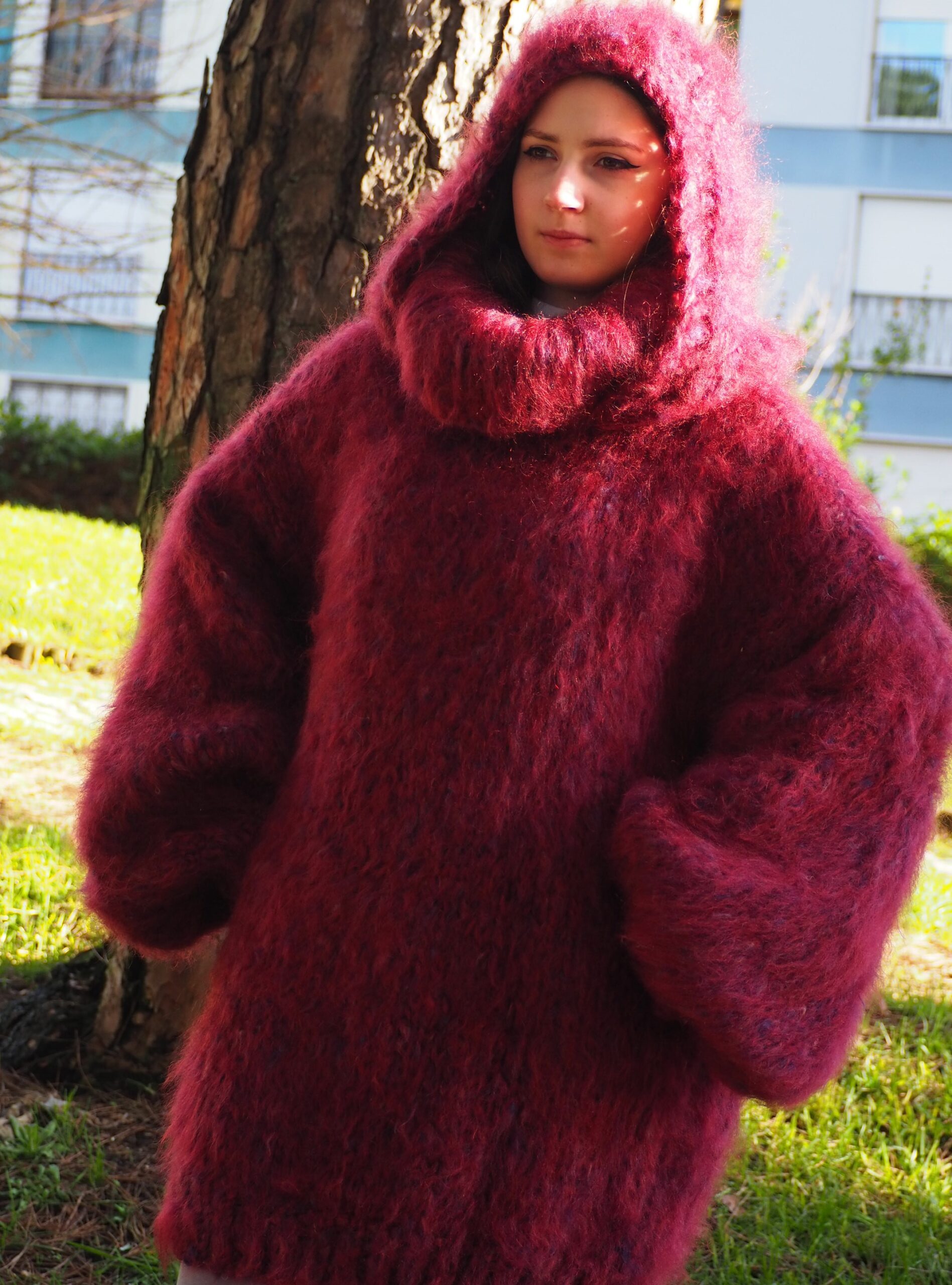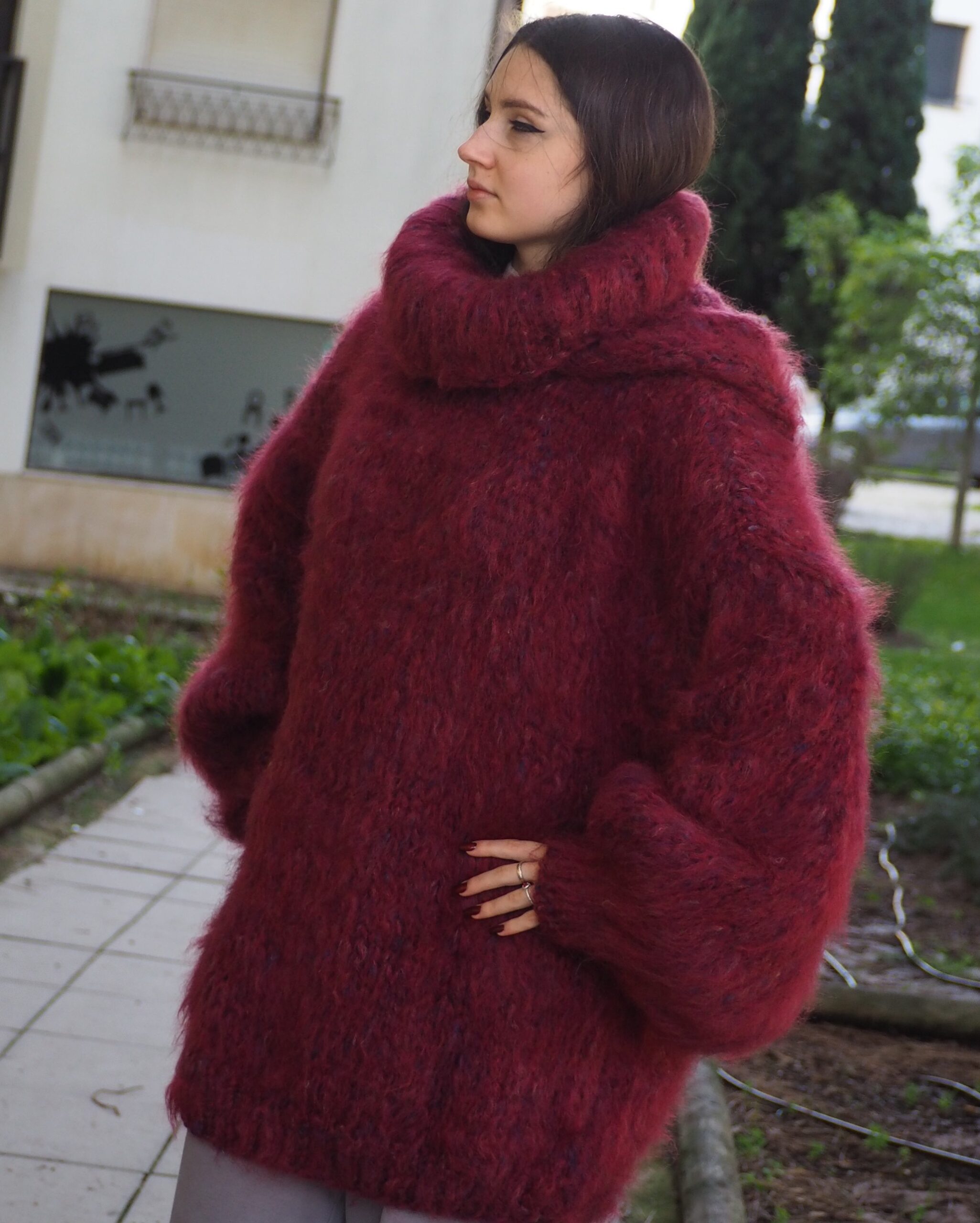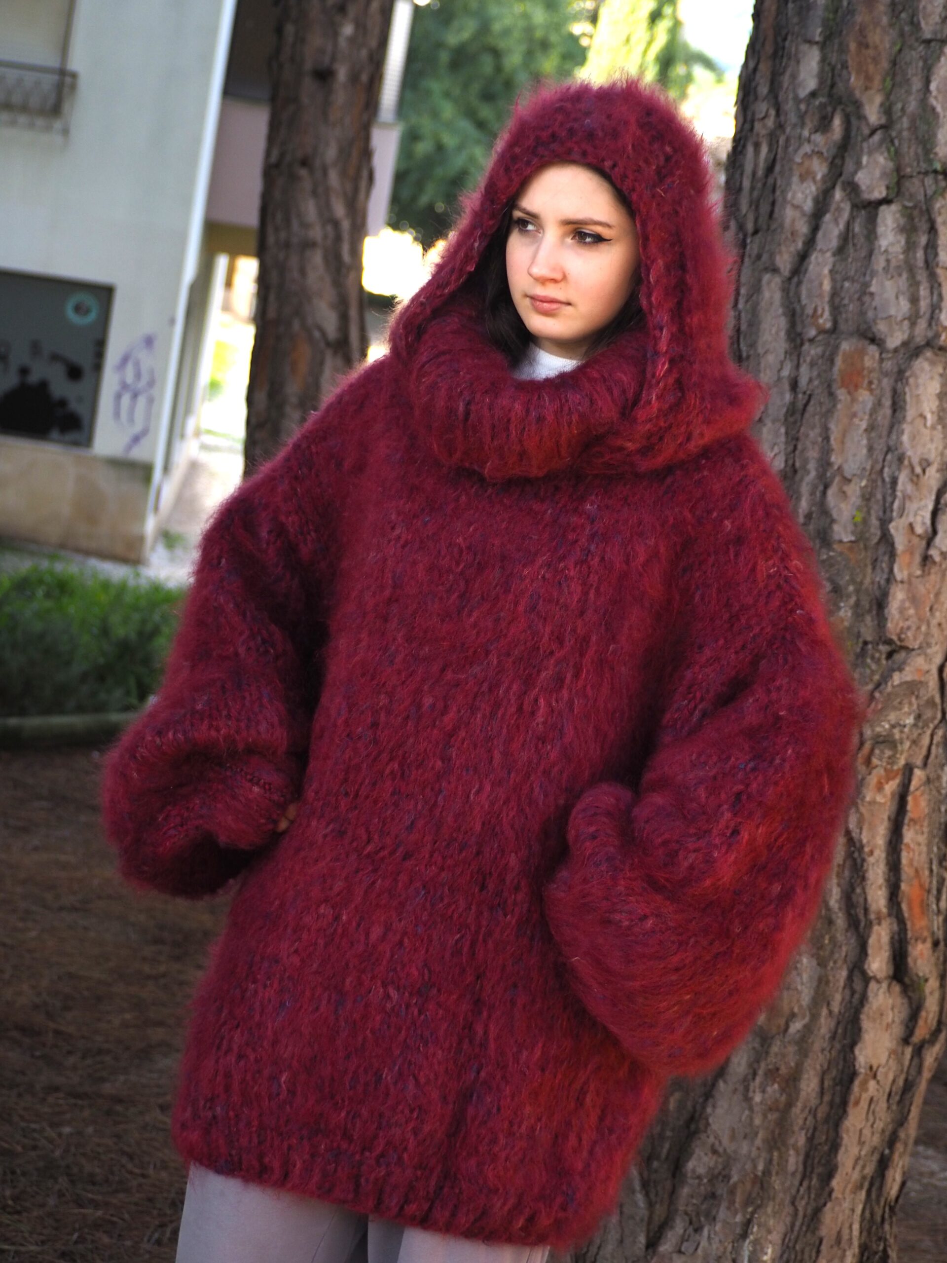 Mohair Sweater Extra Thick Oversize Burgundy T-neck and Hood Handknitted by Lanaknittings