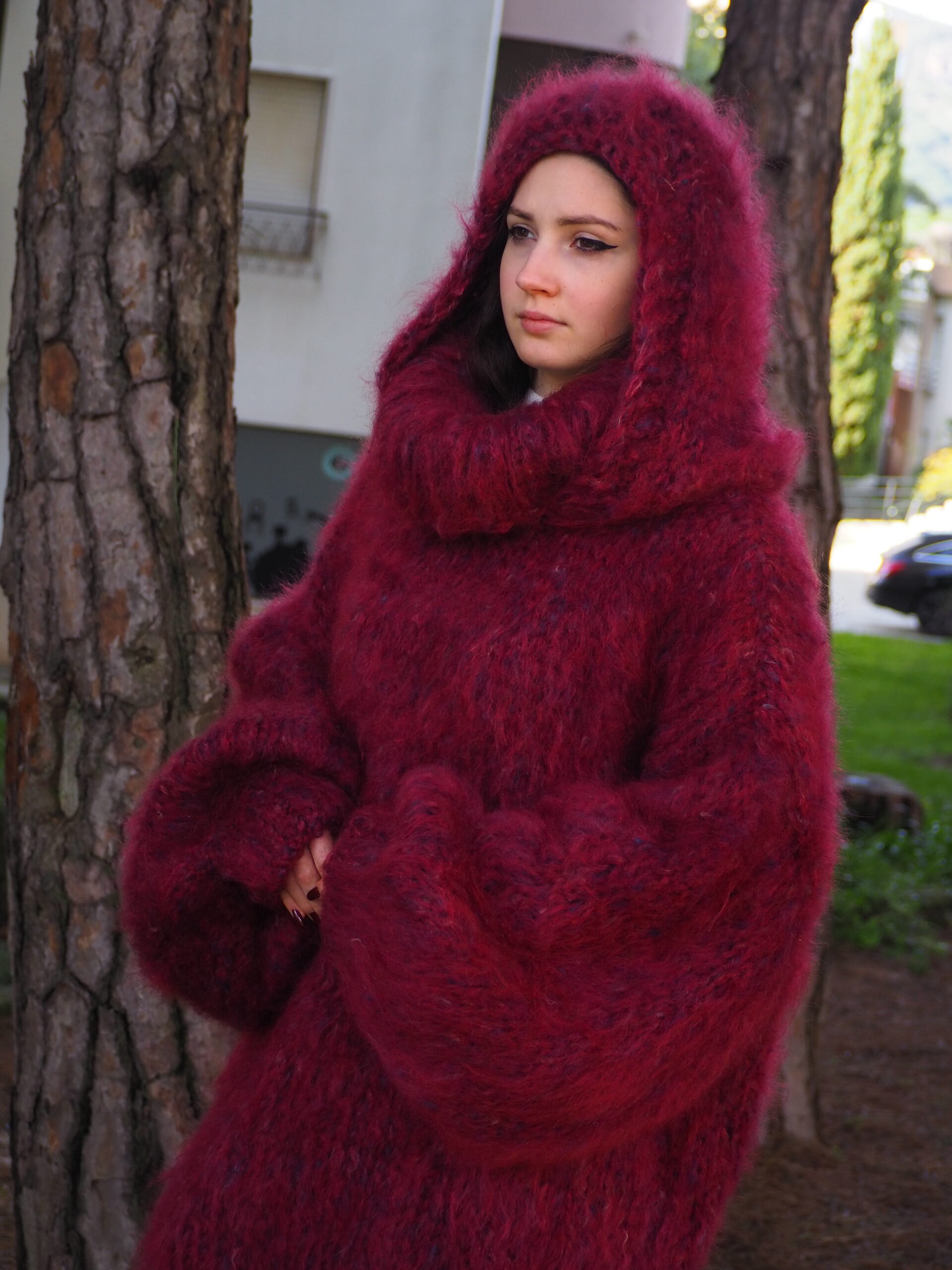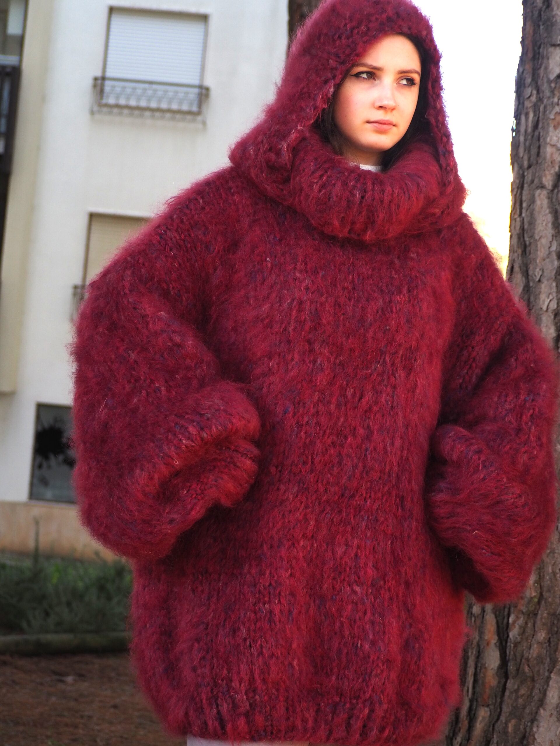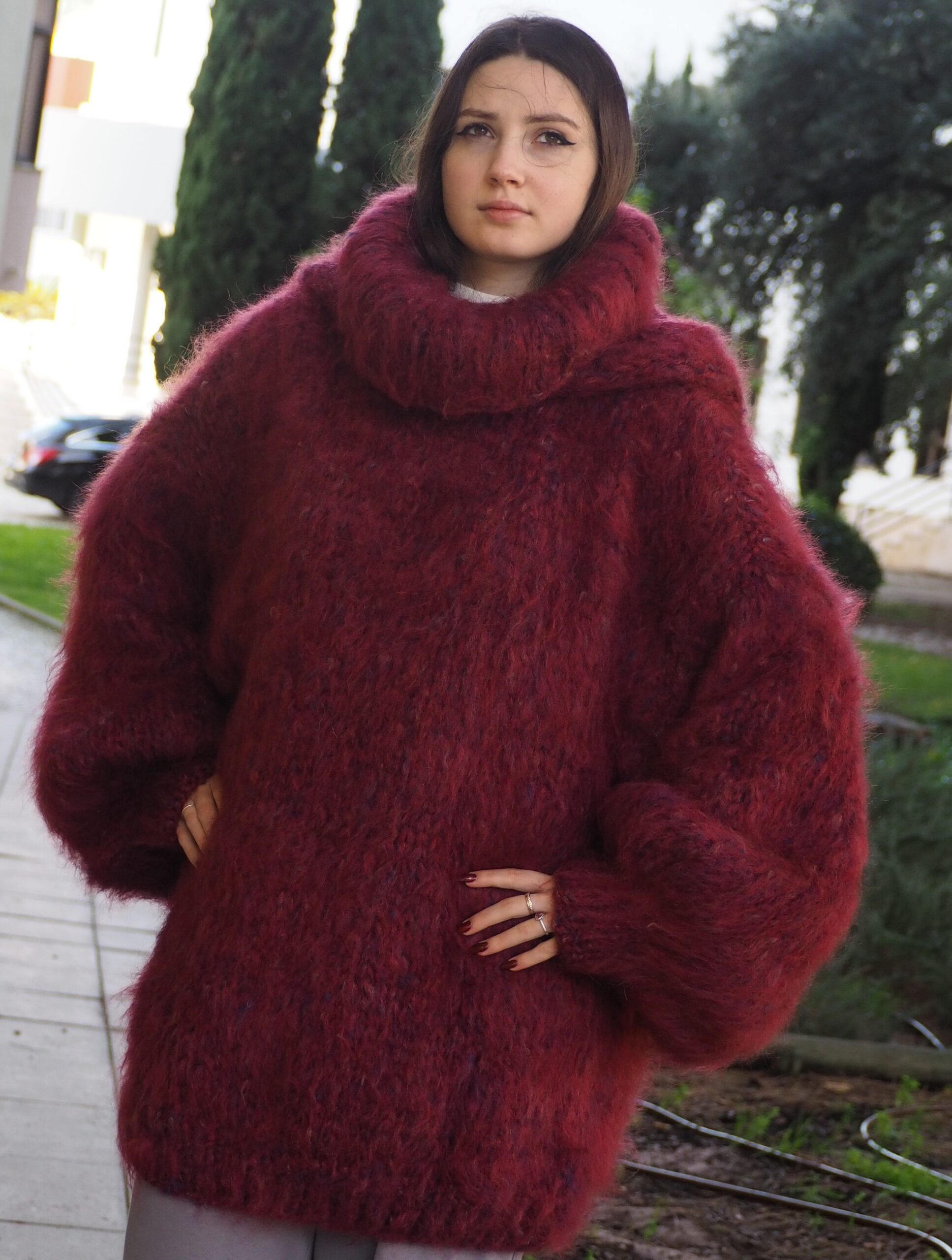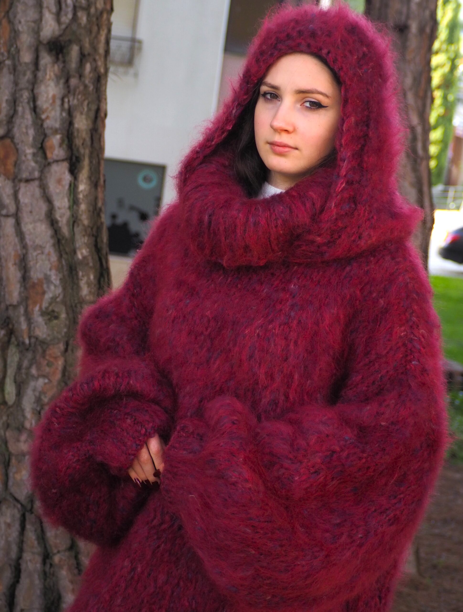 Mohair Sweater Extra Thick Oversize Burgundy T-neck and Hood Handknitted by Lanaknittings
