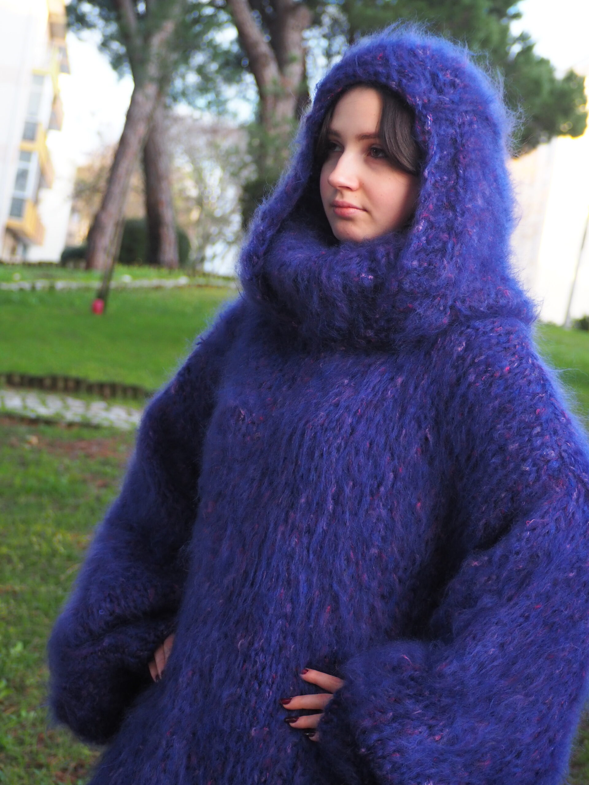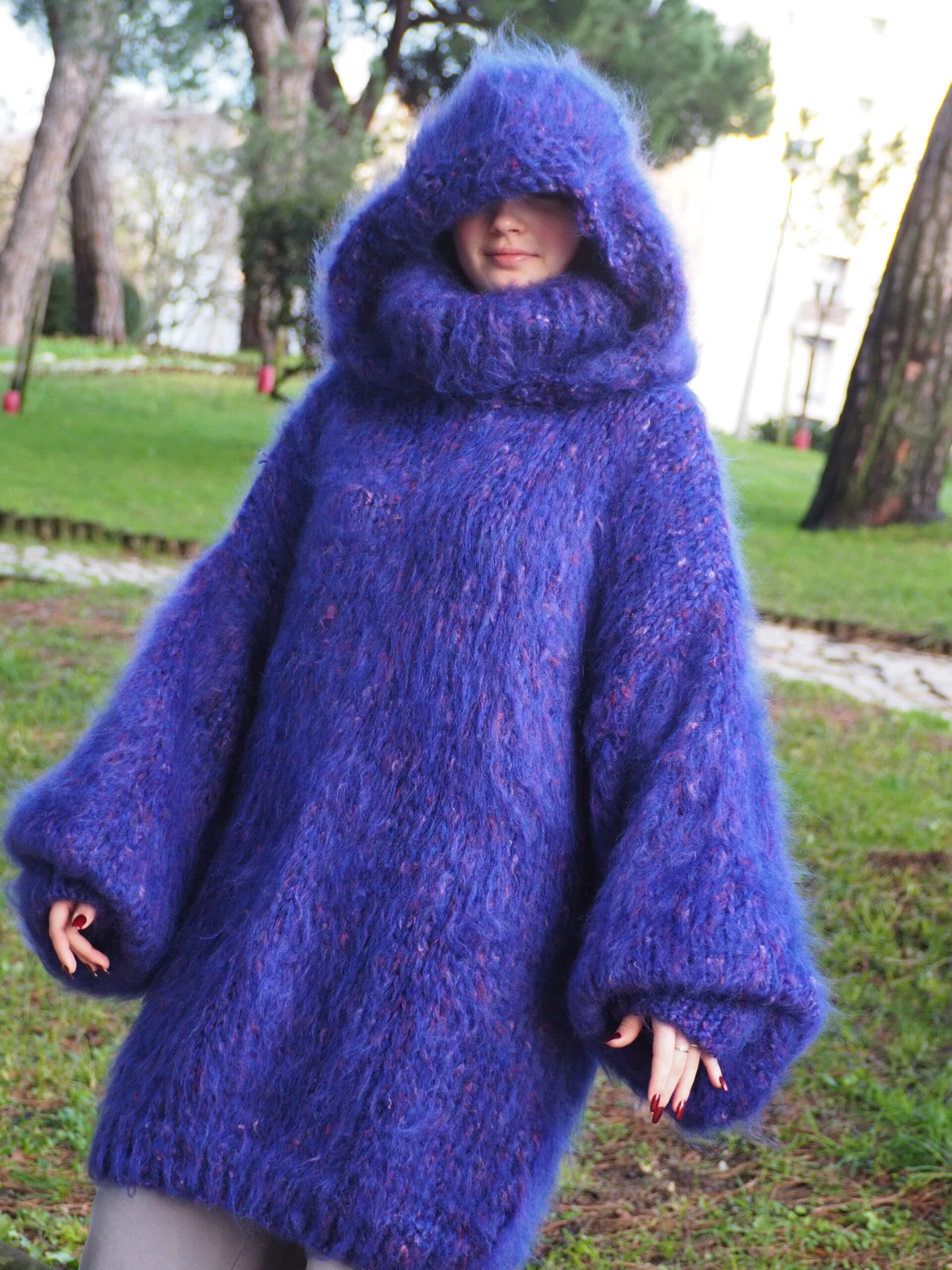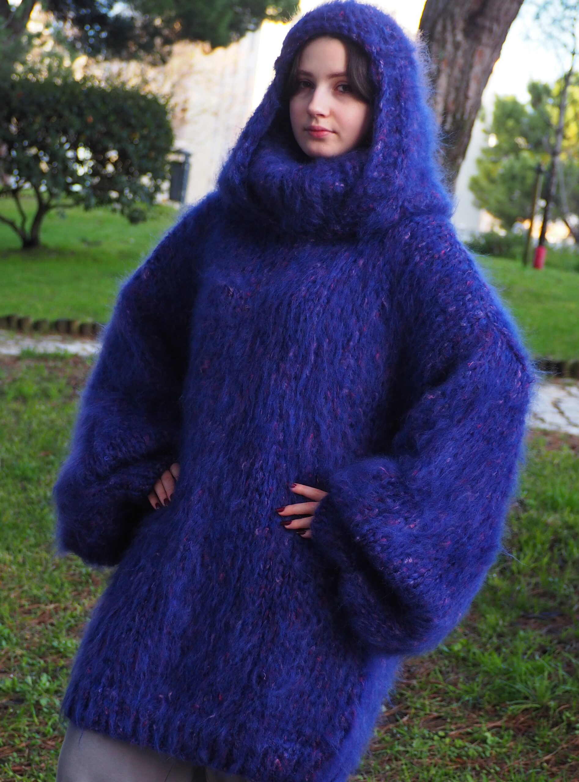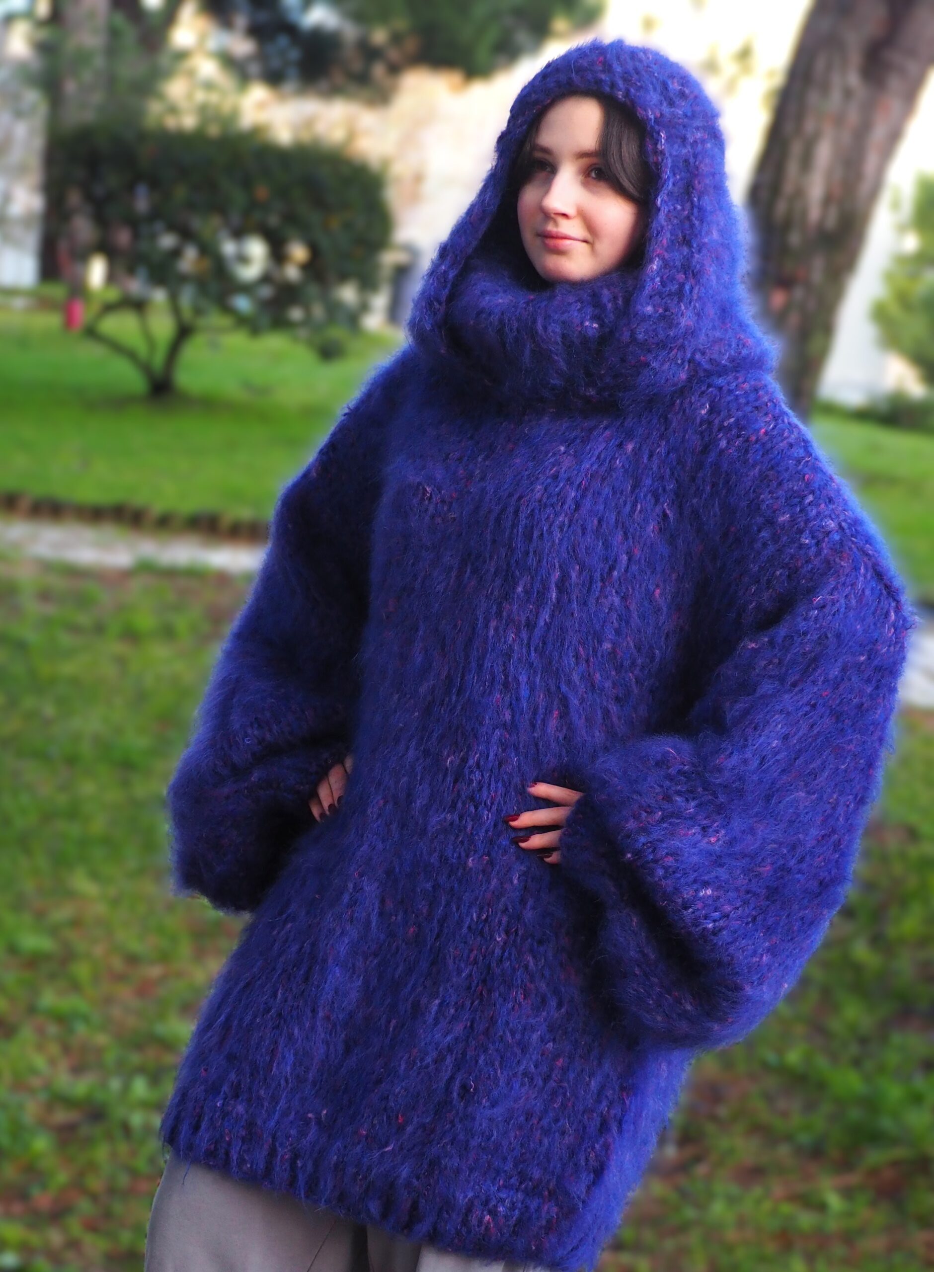 HandKnitted Long hair Mohair Sweater with T-neck and Hood