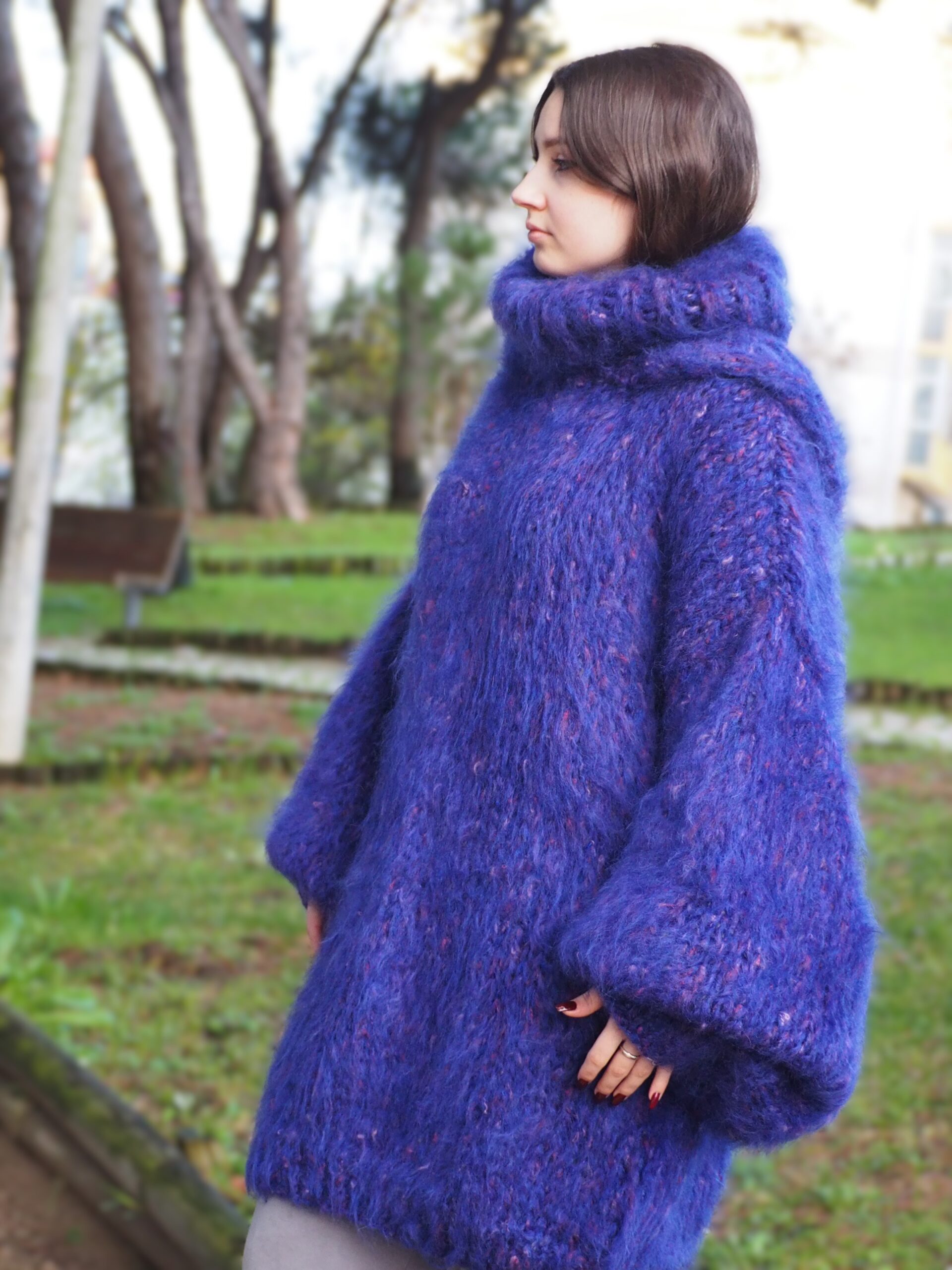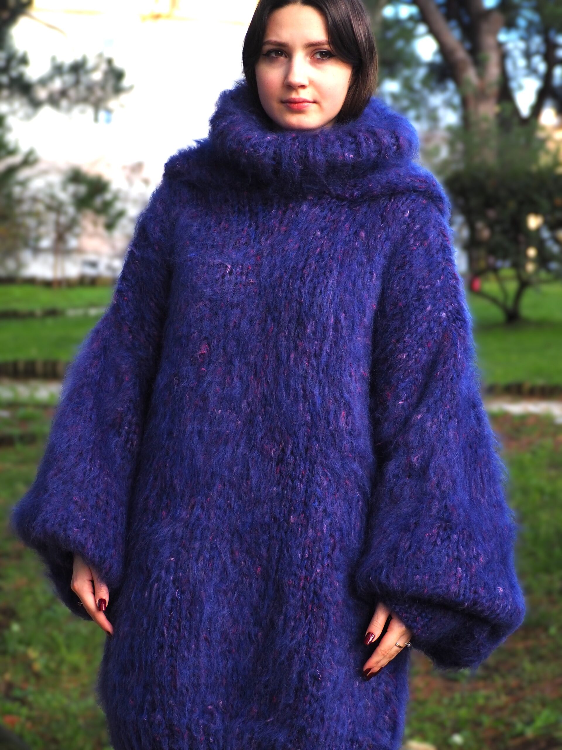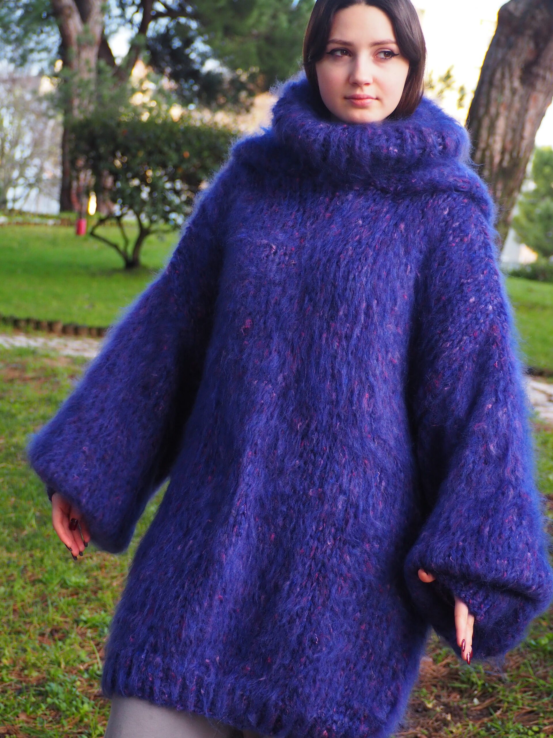 HandKnitted Long hair Mohair Sweater with T-neck and Hood